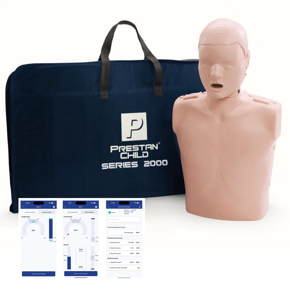 El mismo maniquí infantil profesional de alta calidad y realismo ahora está disponible con retroalimentación avanzada que incluye frecuencia, profundidad, retroceso, ventilación, tiempo sin compresiones y fracción de compresión torácica, a través de la aplicación PRESTAN CPR Feedback con tecnología Bluetooth®, disponible para dispositivos Apple y Android.